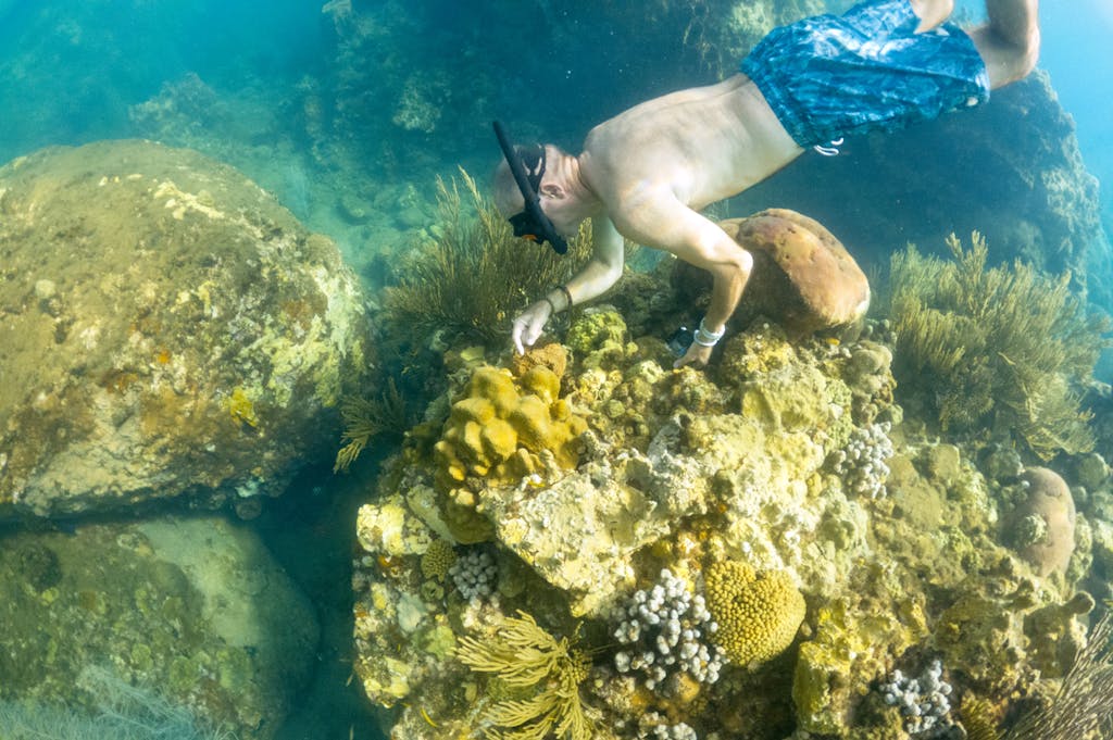 Simon Walsh inspects coral off Dominica’s coast as part of an amateur experiment to see how diseased corals respond to antibiotics. Because bleaching weakens a coral’s resistance to viruses and bacteria, it can lead to problems like stony coral tissue loss disease, which has plagued Dominica’s corals. Meanwhile, ocean acidification exacerbates the issue by dissolving the calcium structure that makes up a coral.