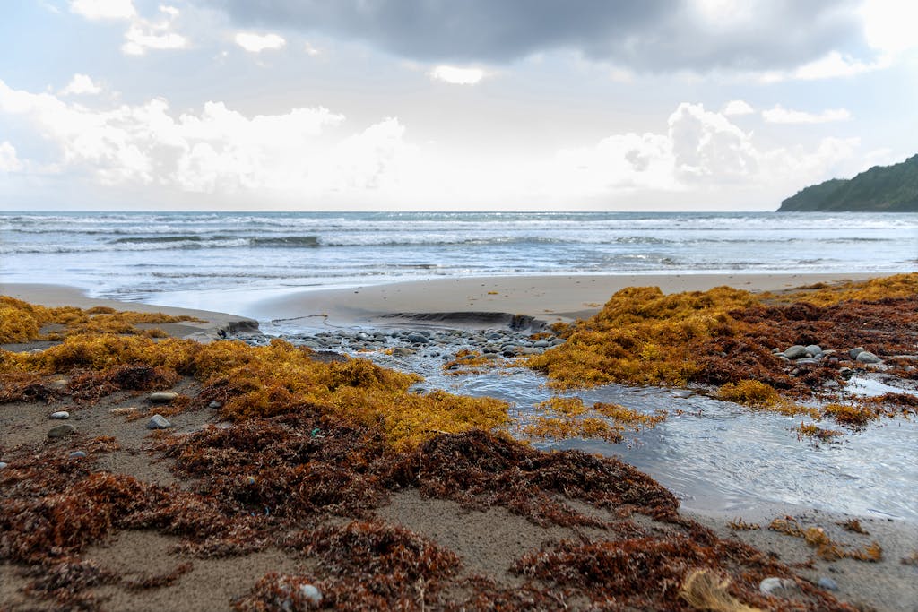Carrying bacteria and plastic pollution ashore, clumps of orange sargassum cover a beach on the Caribbean island of Dominica. The macroalgae has become a global scourge, harming coastal marine life, disrupting shipping routes, spreading disease, and hurting tourism. Climate change is believed to be a root cause of recent record-breaking sargassum blooms. Photo: Kraig Harris/UN Foundation