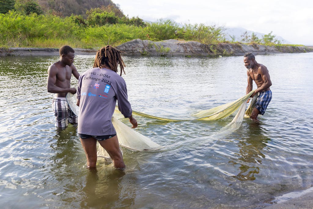 Fisherman in Dominica examine their net for titiwi, a tiny and translucent fish that relies on the planet’s tidal and lunar cycles to survive. The UN Development Programme and the World Food Programme are supporting sustainable and resilient fishing practices in small island nations like Dominica, which is already seeing the impact of rising sea levels, hotter ocean temperatures, more extreme weather, and biodiversity loss among marine life. Photo: Kraig Harris/UN Foundation