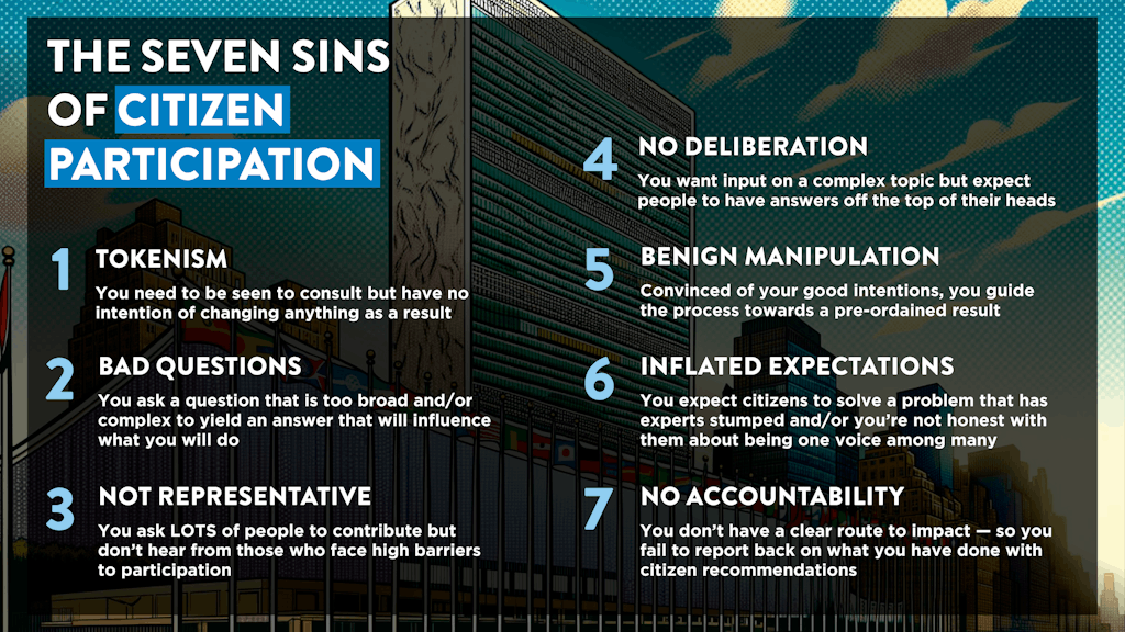 Unfortunately, citizen engagement is often poorly executed. In the challenge paper, we explore what happens when the international system reaches out to people in an ad hoc and unstrategic way, identifying what we call the seven sins of citizen participation. Engaging in tokenistic practices, asking questions that are too broad, not giving people a chance to deliberate, and resorting to “benign manipulation” that can push a process toward a preordained end are some of the most common missteps that undermine effective citizen engagement.