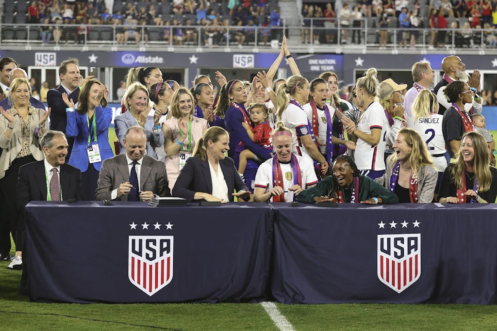 Members of U.S. Soccer and the U.S. women’s nationwide workforce gamers affiliation signal a collective bargaining settlement signifying equal pay between the U.S. males’s and women’s nationwide soccer teams at Audi discipline in Washington, D.C. on September 6, 2022. photograph: Tim Nwachukwu / Getty photos