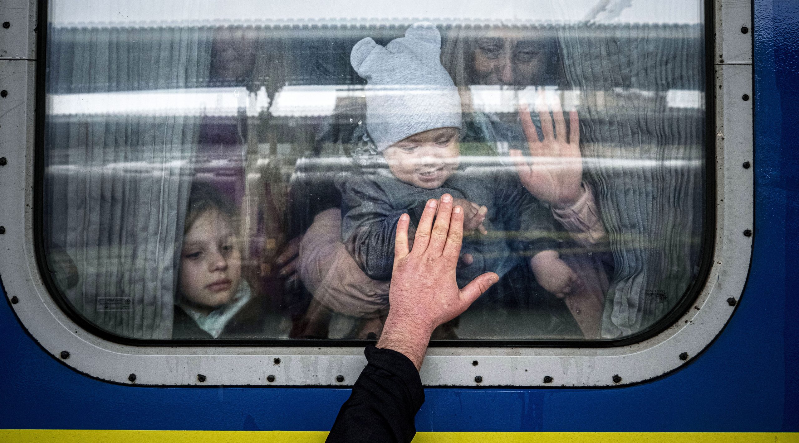 On April 20, 2022, in Kharkiv, Ukraine, a particular person places his hand to the window of a prepare car as he says goodbye to his spouse and kids earlier than they depart on a particular evacuation prepare. picture: Ashley Gilbertson VII / UNICEF