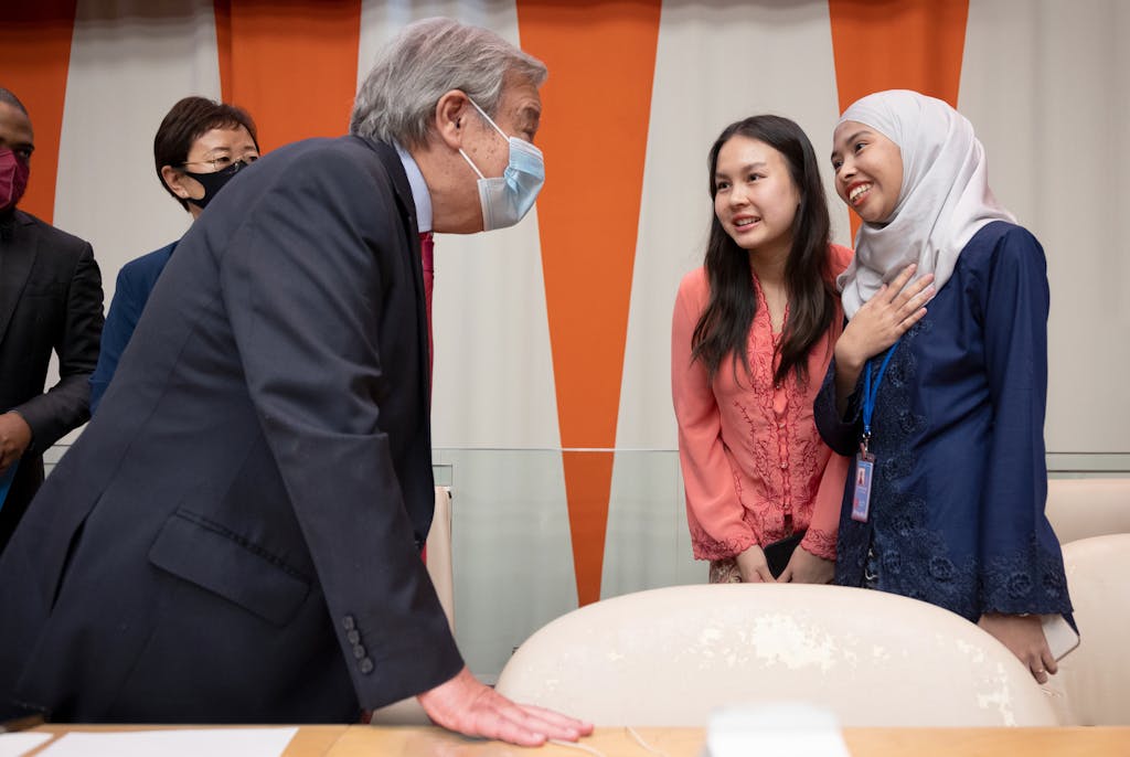 UN Secretary-regular António Guterres speaks with Elisa Shafiqah Shahrilnizam (proper) and Michelle Lee Xi Fuong earlier than the worldwide Day of Peace youth observance held on the theme “finish racism. construct peace.” The event attracts consideration to the significance of combating racism and constructing societies by which all people are dealt with equally.